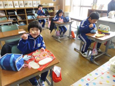 2021年3月16日 12時39分今日から来週月曜日まではお弁当になります。(5年生は明日から)色とりどりのお弁当に心なしか子ども達もうれしそうな表情です。今日は,1・2年生のお弁当を紹介します。