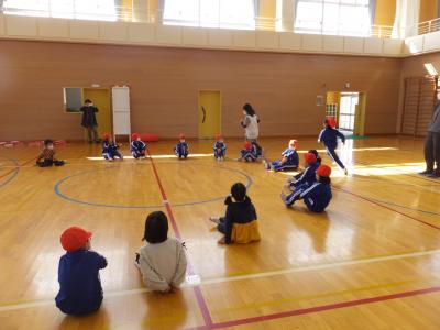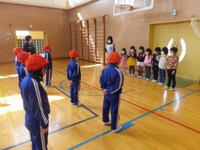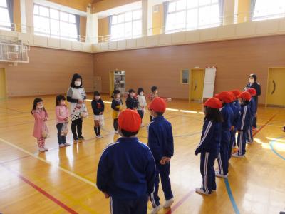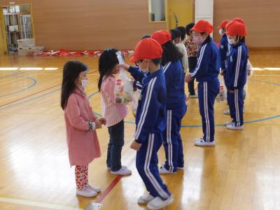 1年生は,来年度入学予定の八沢幼稚園児と交流をしています。短い時間でしたが,一緒にゲームで楽しんだあと,プレゼントを手渡しました。4月からは同じ階で生活します。首を長くして待っていますので安心して入学してください。