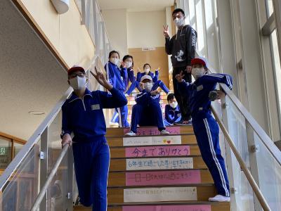 2021年3月19日 13時49分6年生は,卒業を前に在校生に素敵な言葉の贈り物をしてくれました。二つの階段に在校生に向けてメッセージが飾られました。これから毎朝このメッセージを見て,ますます良い学校にしていきたいと思います。