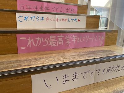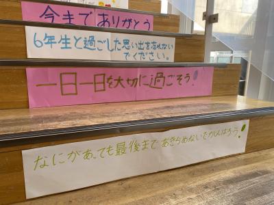 6年生は,卒業を前に在校生に素敵な言葉の贈り物をしてくれました。二つの階段に在校生に向けてメッセージが飾られました。これから毎朝このメッセージを見て,ますます良い学校にしていきたいと思います。