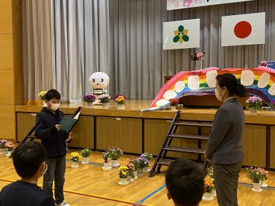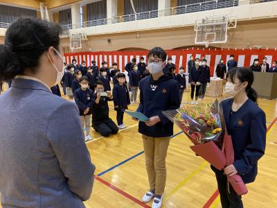 2021年3月22日 10時16分今日は,全校生で今年退職される校長先生へ感謝の気持ちを伝える会を行いました。校長先生には内緒で準備を進め,卒業式の練習後にサプライズで行いました。今まで子ども達を温かいまなざしでいつも見守ってくださった校長先生に代表の6年生が感謝の言葉とプレゼント,花束を贈りました。校長先生もとても感激した様子でした。