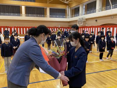 今日は,全校生で今年退職される校長先生へ感謝の気持ちを伝える会を行いました。校長先生には内緒で準備を進め,卒業式の練習後にサプライズで行いました。今まで子ども達を温かいまなざしでいつも見守ってくださった校長先生に代表の6年生が感謝の言葉とプレゼント,花束を贈りました。校長先生もとても感激した様子でした。