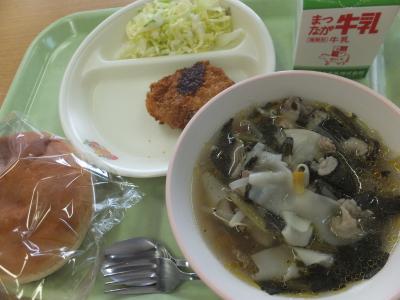 2021年4月9日 12時16分今日の献立は,丸パン,カジキカツソースかけ,添えキャベツ,ワンタンスープ,牛乳です。