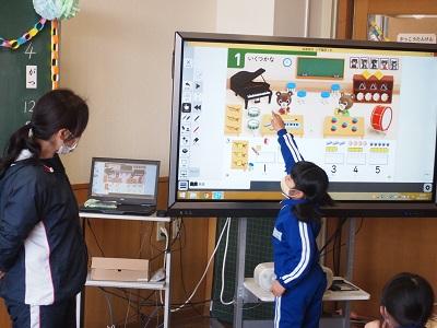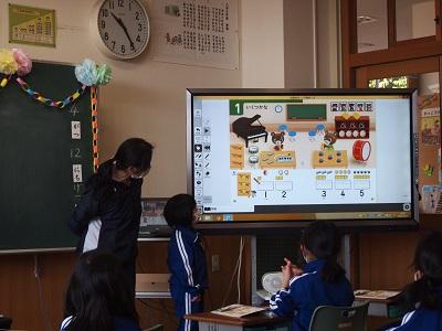1年生も,さっそくICTを使って授業を行っています。算数の授業では,デジタル教科書を使って数の学習を子どもが説明していました。視覚的に捉えることができ大変効果的です。