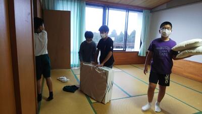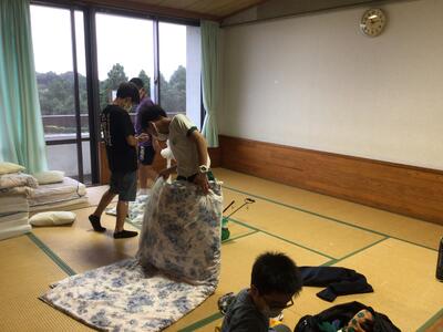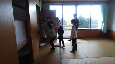 宿泊活動2日目、全員元気に活動を開始しました。朝食前に、協力して部屋の片付けや清掃を行いました。