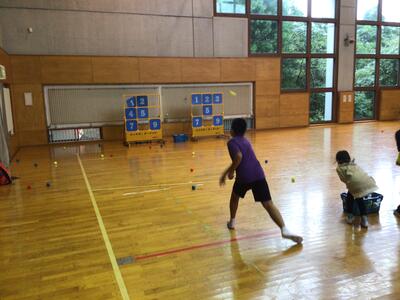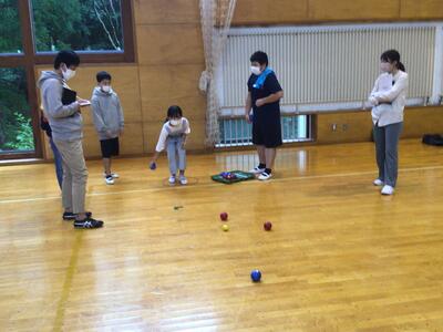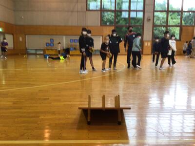 2021年10月13日 09時01分雨天のため、室内スポーツ体験を行っています。各グループごとにルールや進め方を工夫して楽しんでいます。