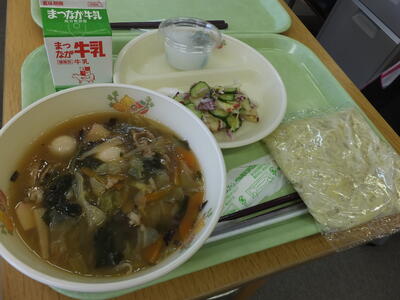 今日の給食は,広東麺,彩果サラダ,ラクピスゼリー,牛乳です。