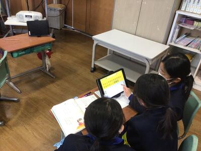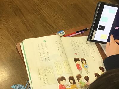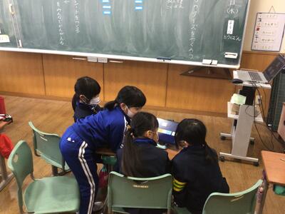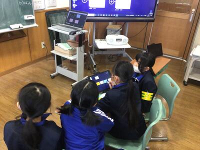 1年生の国語で,幼稚園のみなさんに答えてもらうクイズを作っています。ロイロノートを使って,問題や答えが見やすくなるように工夫しているようです。誰にどのように伝えるのか,相手意識を持つことが大切です。