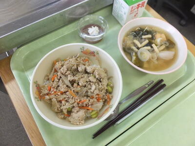 今日の給食は,鶏そぼろ丼,根菜のみそ汁,手作りココアプリン,牛乳です。