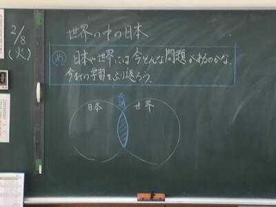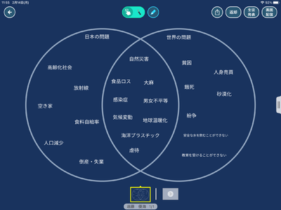 2022年2月14日 12時02分6年生社会科で世界の中の日本について学習しています。今日は,ベン図を使い日本の問題,世界の問題,共通する問題についてそれぞれの考えをまとめ,ロイロノートを使って共有しました。子どもたちは,話し合いを通して解決しなければならないことが数多くあることを感じていました。