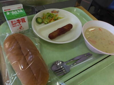 今日の給食は,セルフウインナードックパン,イタリアンサラダ,鶏肉と野菜の豆乳スープ,牛乳です。