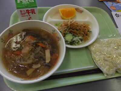 今日の給食は,広東麺,パリパリサラダ,清美オレンジ,牛乳です。