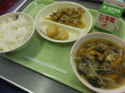 今日の給食は、ごはん、いかナゲット、青椒肉絲、野菜スープ、牛乳です。