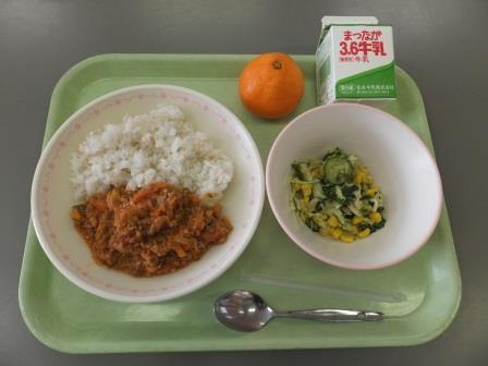 今日の献立は、「タコライス、ほうれん草のサラダ、みかん、牛乳」でした。