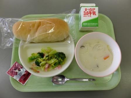 今日の献立は、「コッペパン、ホワイトシチュー、ブロッコリーのサラダ、大豆チョコクリーム、牛乳」でした。