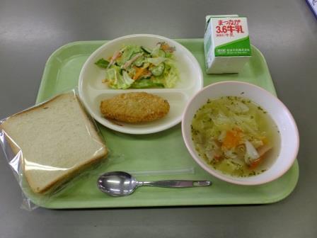 今日の献立は、「食パン、ポトフ、フレンチサラダ、コーンコロッケ、牛乳」でした。