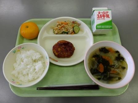 今日の献立は、「ご飯、白菜スープ、ハンバーグのトマトソースかけ、切り干し大根のサラダ、みかん、牛乳」でした。