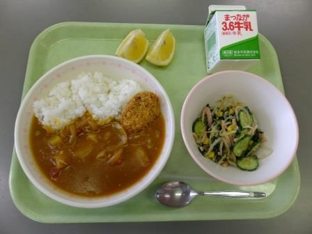今日の献立は、「カツカレー、ポパイサラダ、はるか、牛乳」でした。