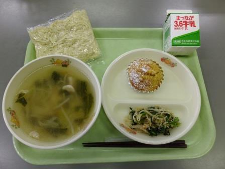 今日の献立は、「タンメン、小松菜のごま酢和え、キャロットマフィン、牛乳」でした。
