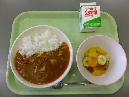 今日の献立は、「ビーンズカレー、フルーツポンチ、牛乳」でした。