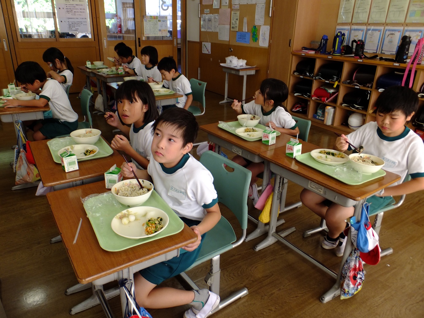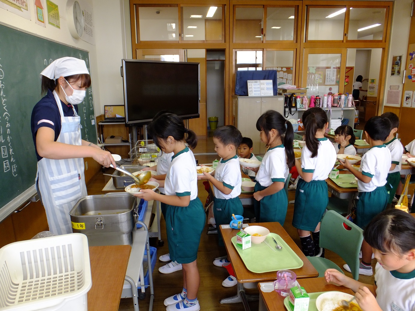 1年教室では、子どもたちが並んでおかわりをしていました。