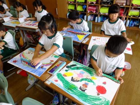 自分が乗ってみたい乗り物や生きものをのびのびと絵に表していました。