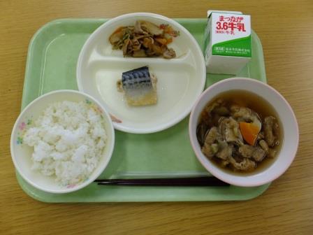 今日の献立は「ご飯、鯖の味噌煮、五目きんぴら、秋野菜汁、牛乳」です。