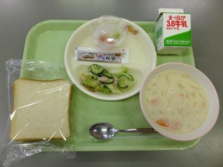 今日の献立は、「食パン、キャラメルクリーム、ツナサラダ、豆乳スープ、ラクピスゼリー、牛乳」でした。